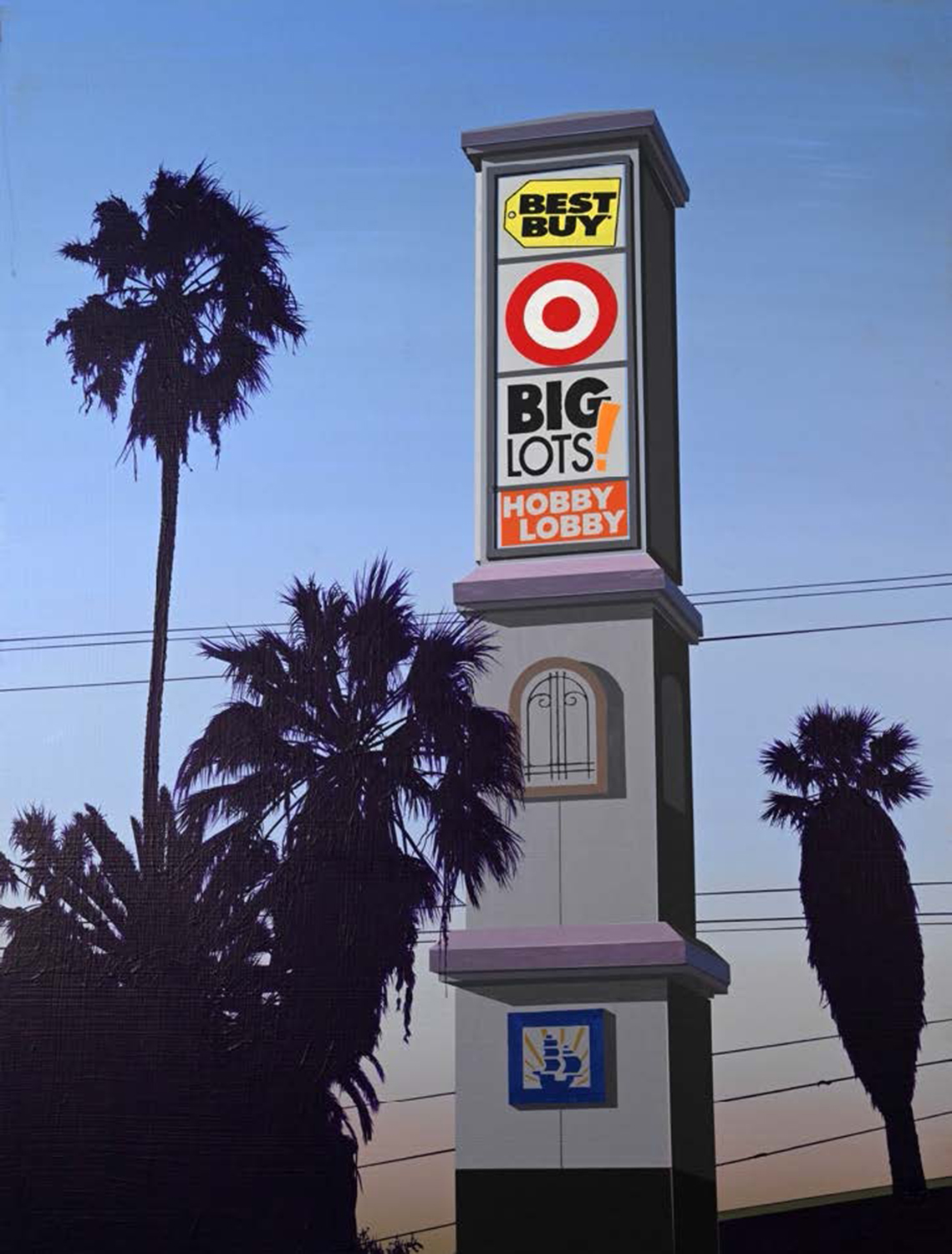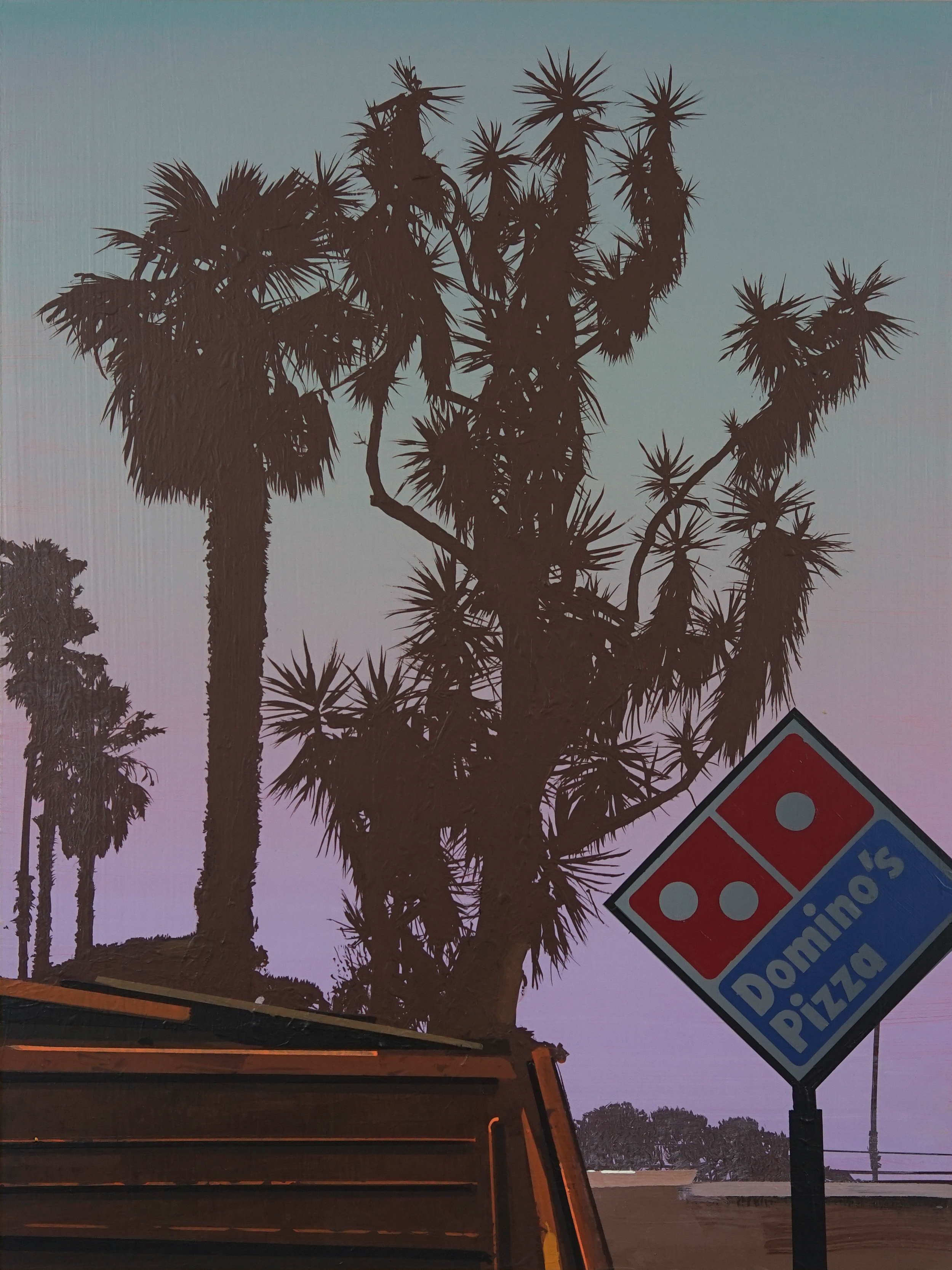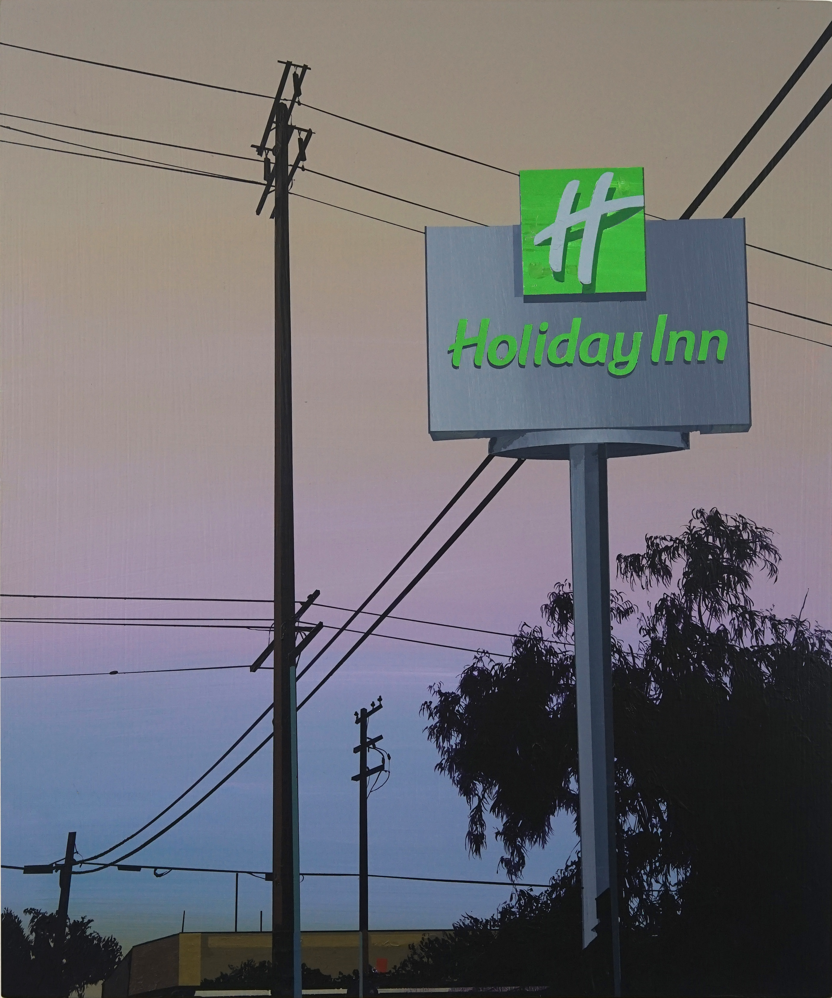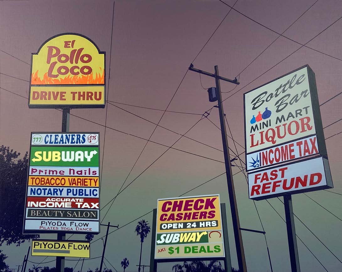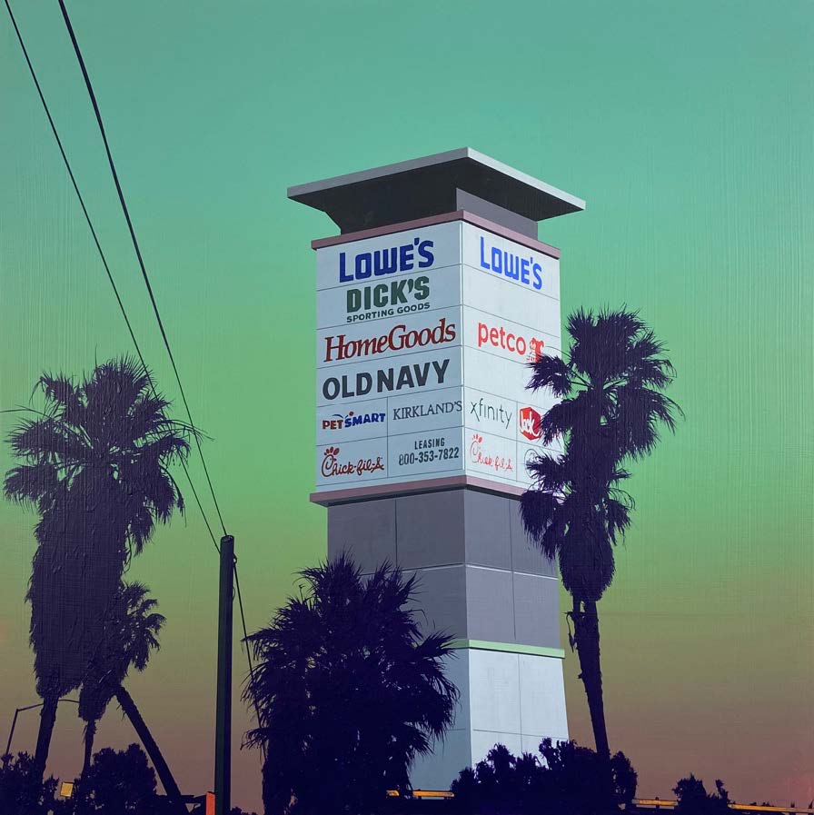 Glen Rubsamen’s craft is painting, which he treats as a traditionally established medium. Yet what appears at first glance to be traditional is at the same time the very source of Rubsamen’s subversiveness. His scenic and artistic views invariably play out against an impressive celestial backdrop that contrasts sharply and spectacularly with the silhouette-like black figures arrayed in the foreground – figures, incidentally, that cannot move; not just because they are painted, but also because they are usually things that are rooted to the spot, such as trees, antennae, and more recently, huge billboards. In spite of their immobility, they are protagonists in the sense that they narrate so much. Their narrative comes from their role serving as representatives of overarching themes. The images appear like film stills, exuding an air of calm and drama. And they all look remarkably Californian – which is still one of the classic projections of the western imagination. —Axel Jablonski