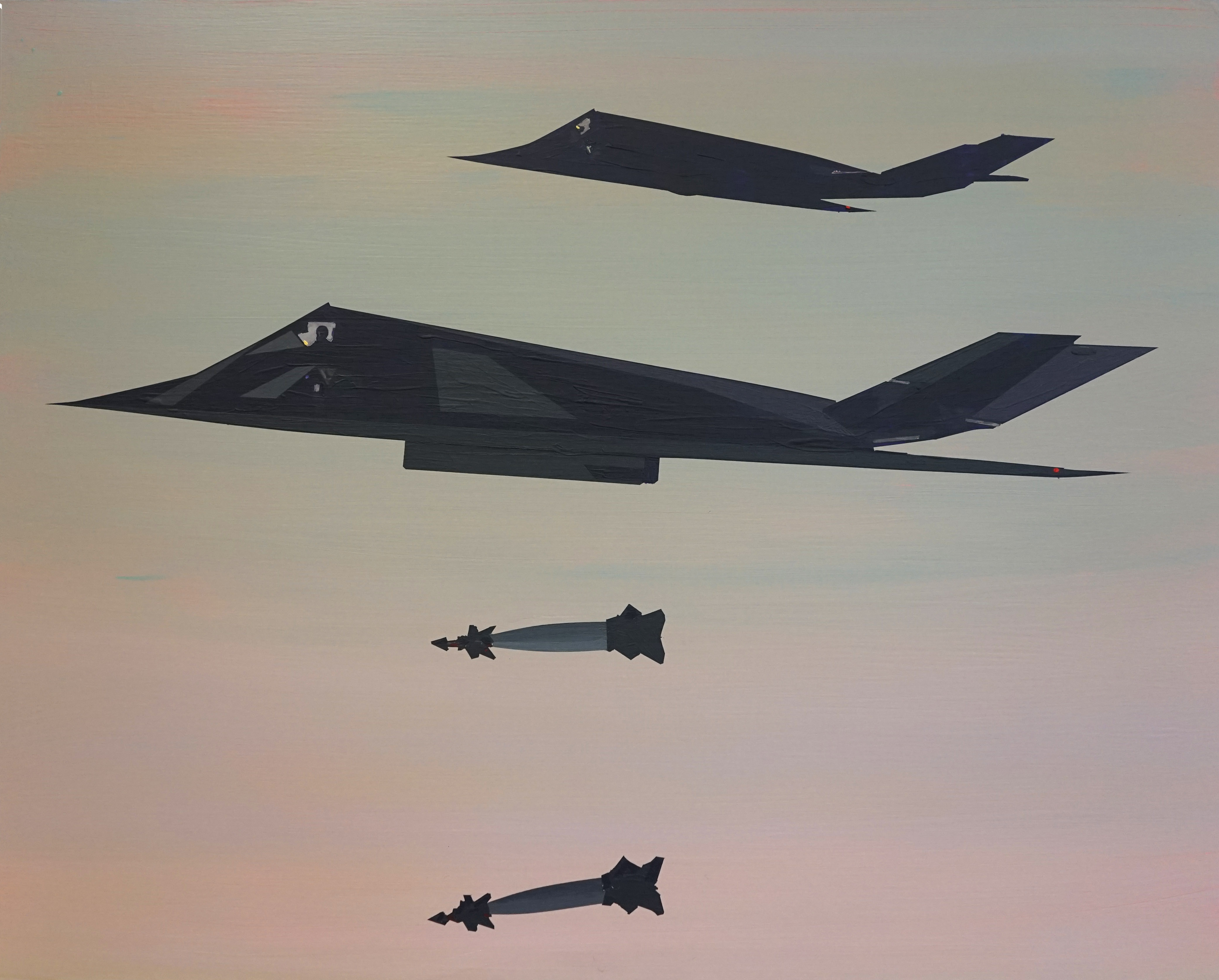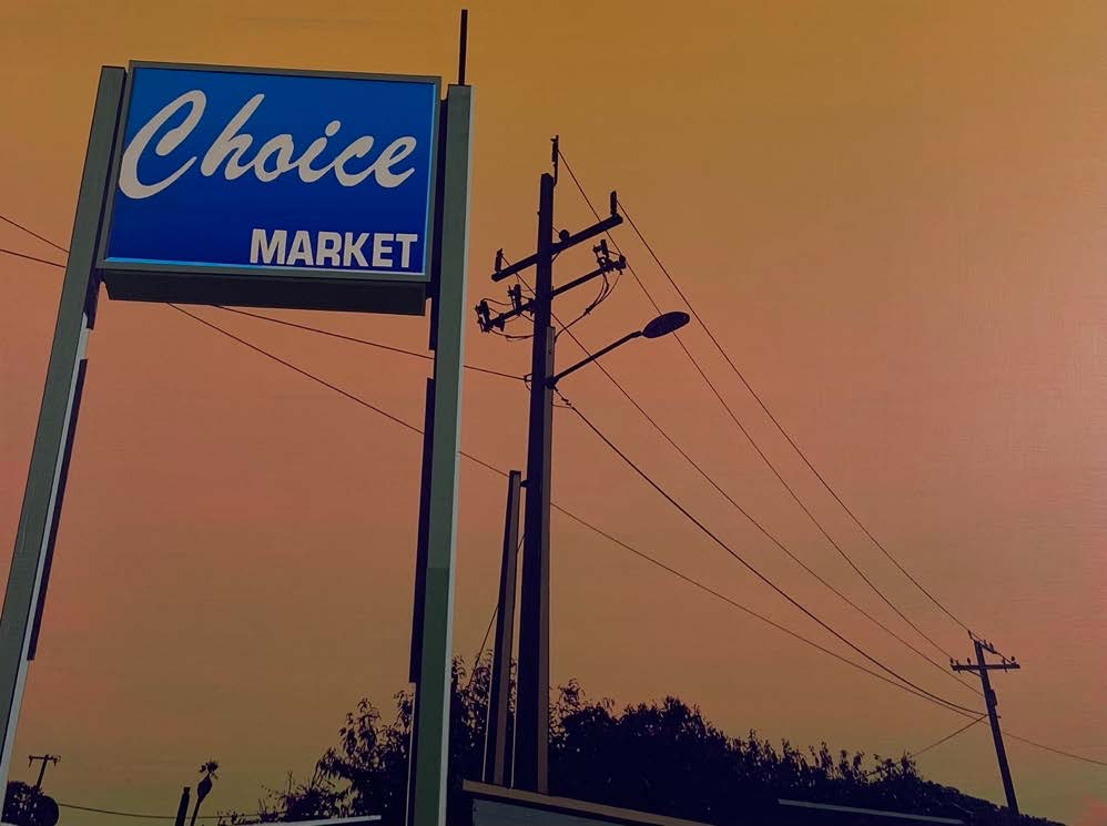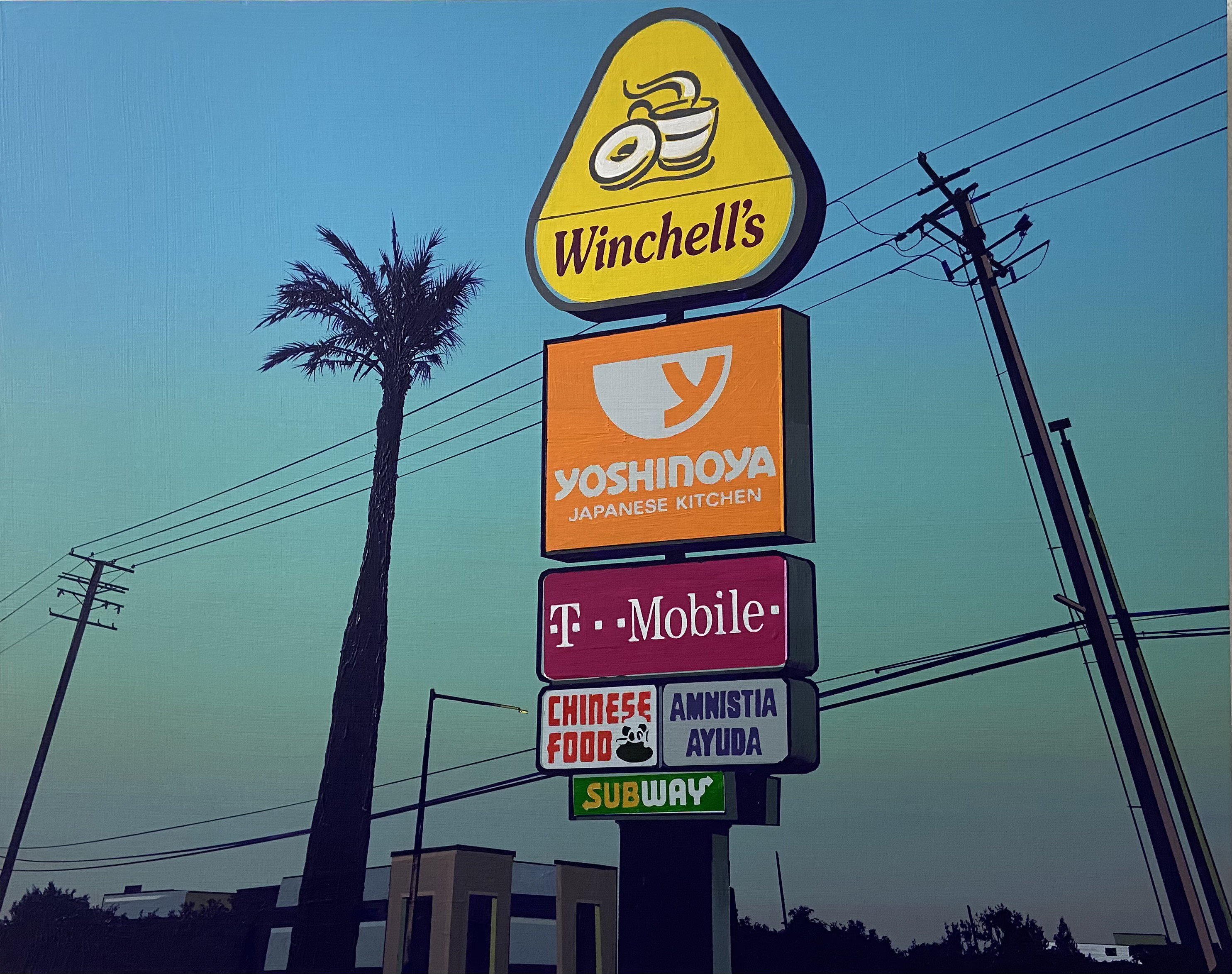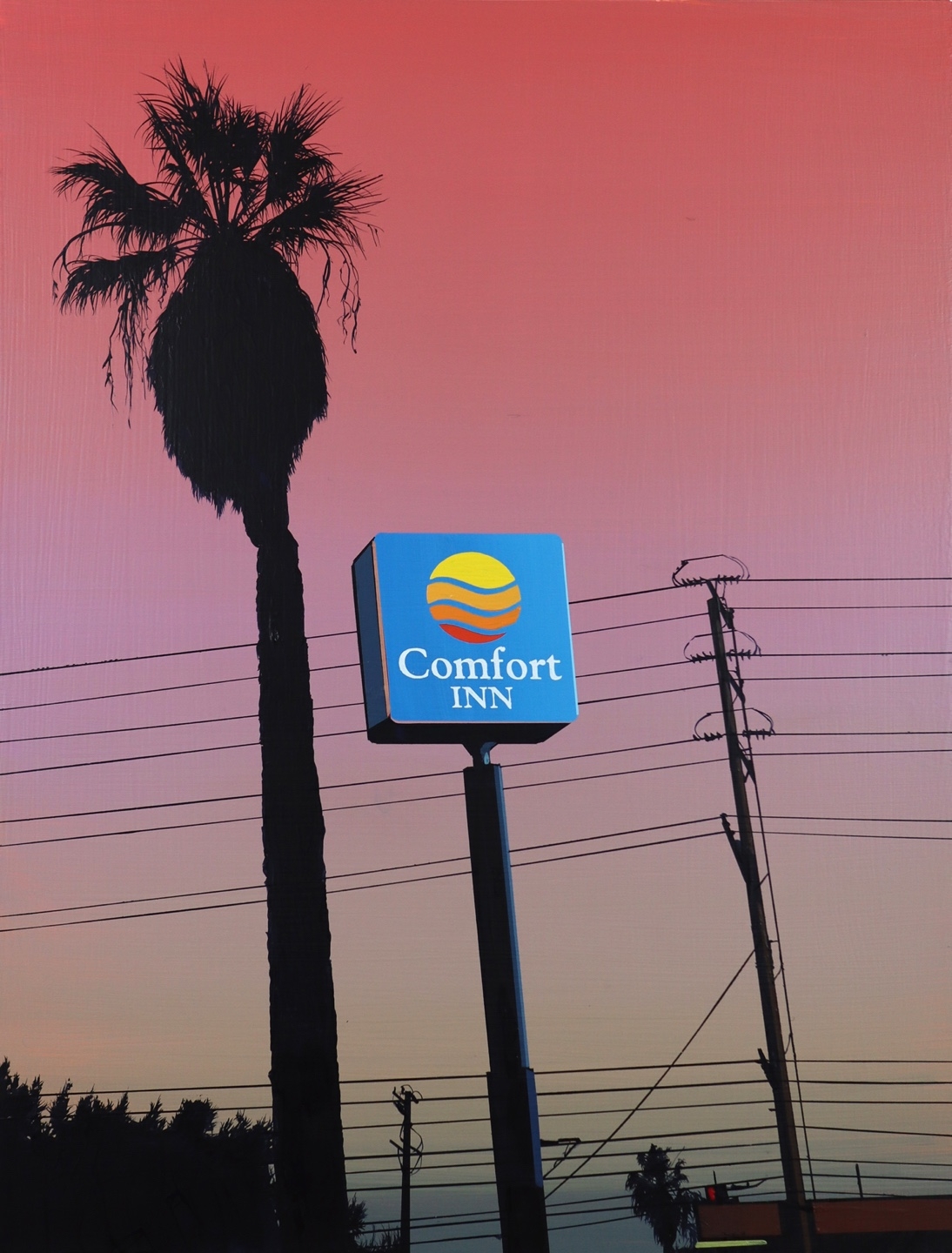 Glen Rubsamen’s craft is painting, which he treats as a traditionally established medium. Yet what appears at first glance to be traditional is at the same time the very source of Rubsamen’s subversiveness. His scenic and artistic views invariably play out against an impressive celestial backdrop that contrasts sharply and spectacularly with the silhouette-like black figures arrayed in the foreground – figures, incidentally, that cannot move; not just because they are painted, but also because they are usually things that are rooted to the spot, such as trees, antennae, and more recently, huge billboards. In spite of their immobility, they are protagonists in the sense that they narrate so much. Their narrative comes from their role serving as representatives of overarching themes. The images appear like film stills, exuding an air of calm and drama. And they all look remarkably Californian – which is still one of the classic projections of the western imagination. —Axel Jablonski
