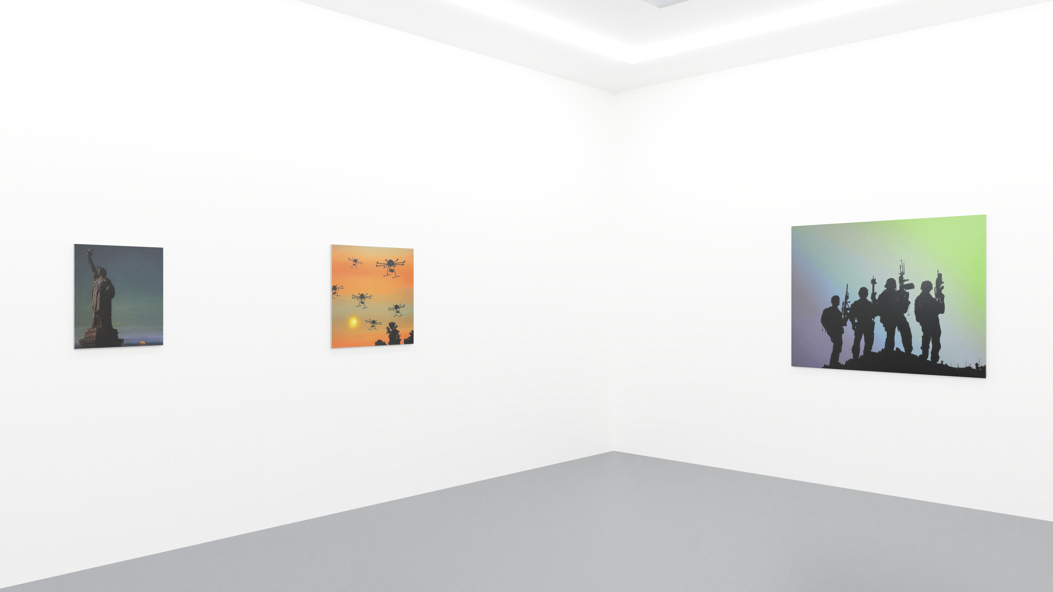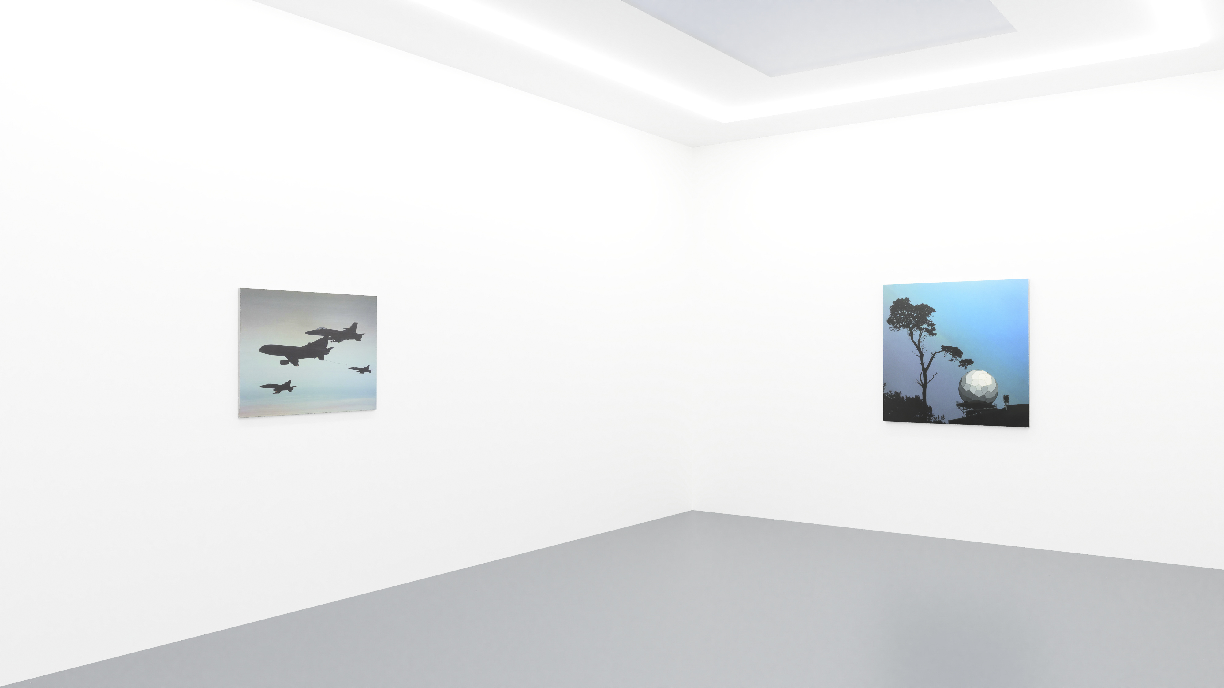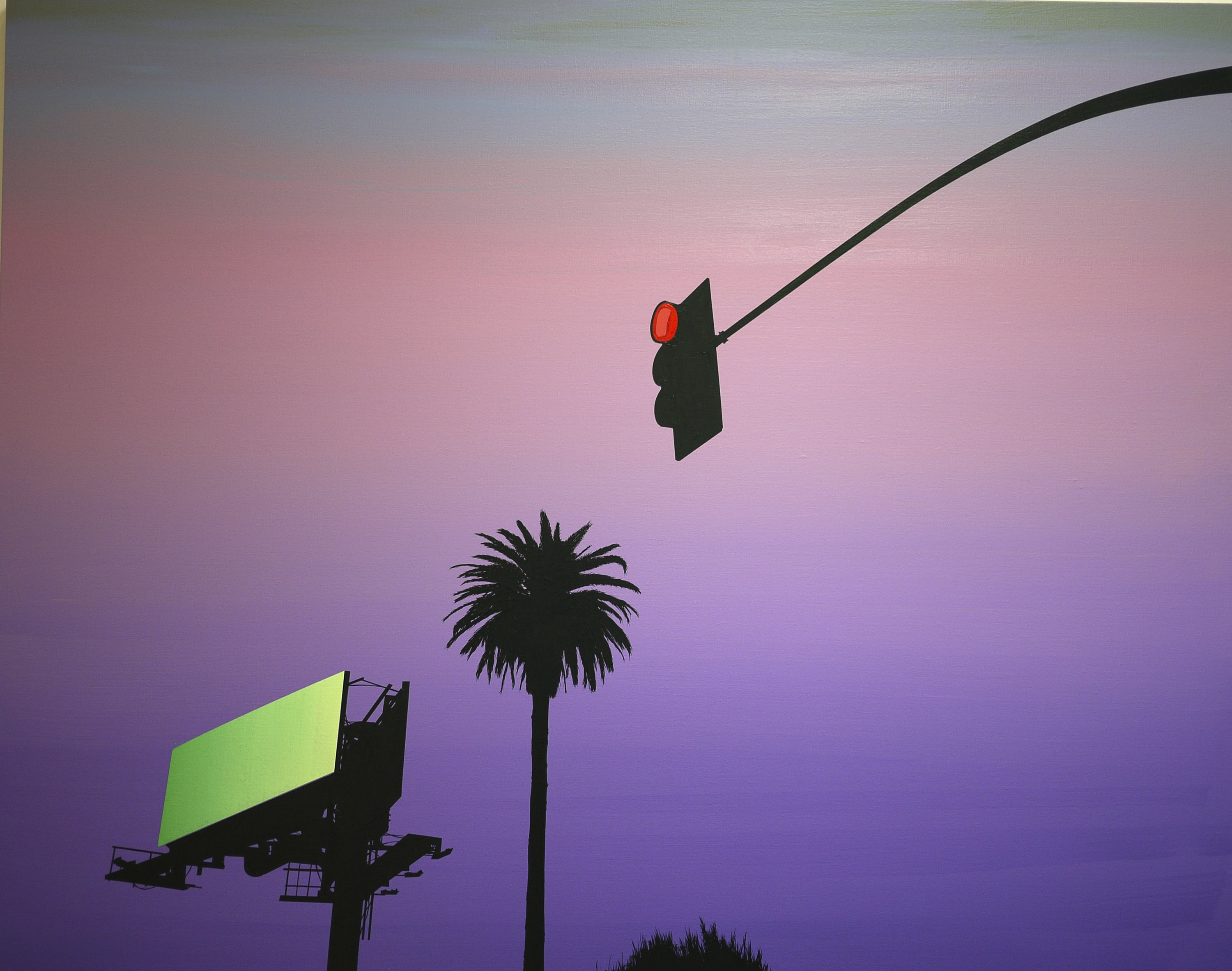 Glen Rubsamen’s craft is painting, which he treats as a traditionally established medium. Yet what appears at first glance to be traditional is at the same time the very source of Rubsamen’s subversiveness. His scenic and artistic views invariably play out against an impressive celestial backdrop that contrasts sharply and spectacularly with the silhouette-like black figures arrayed in the foreground – figures, incidentally, that cannot move; not just because they are painted, but also because they are usually things that are rooted to the spot, such as trees, antennae, and more recently, huge billboards. In spite of their immobility, they are protagonists in the sense that they narrate so much. Their narrative comes from their role serving as representatives of overarching themes. The images appear like film stills, exuding an air of calm and drama. And they all look remarkably Californian – which is still one of the classic projections of the western imagination. —Axel Jablonski