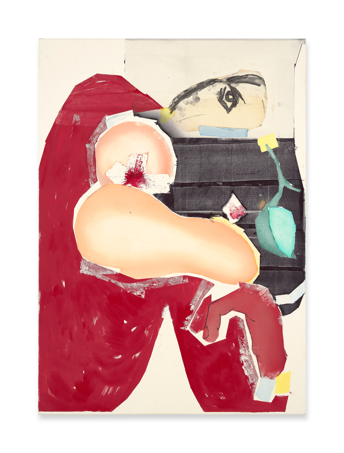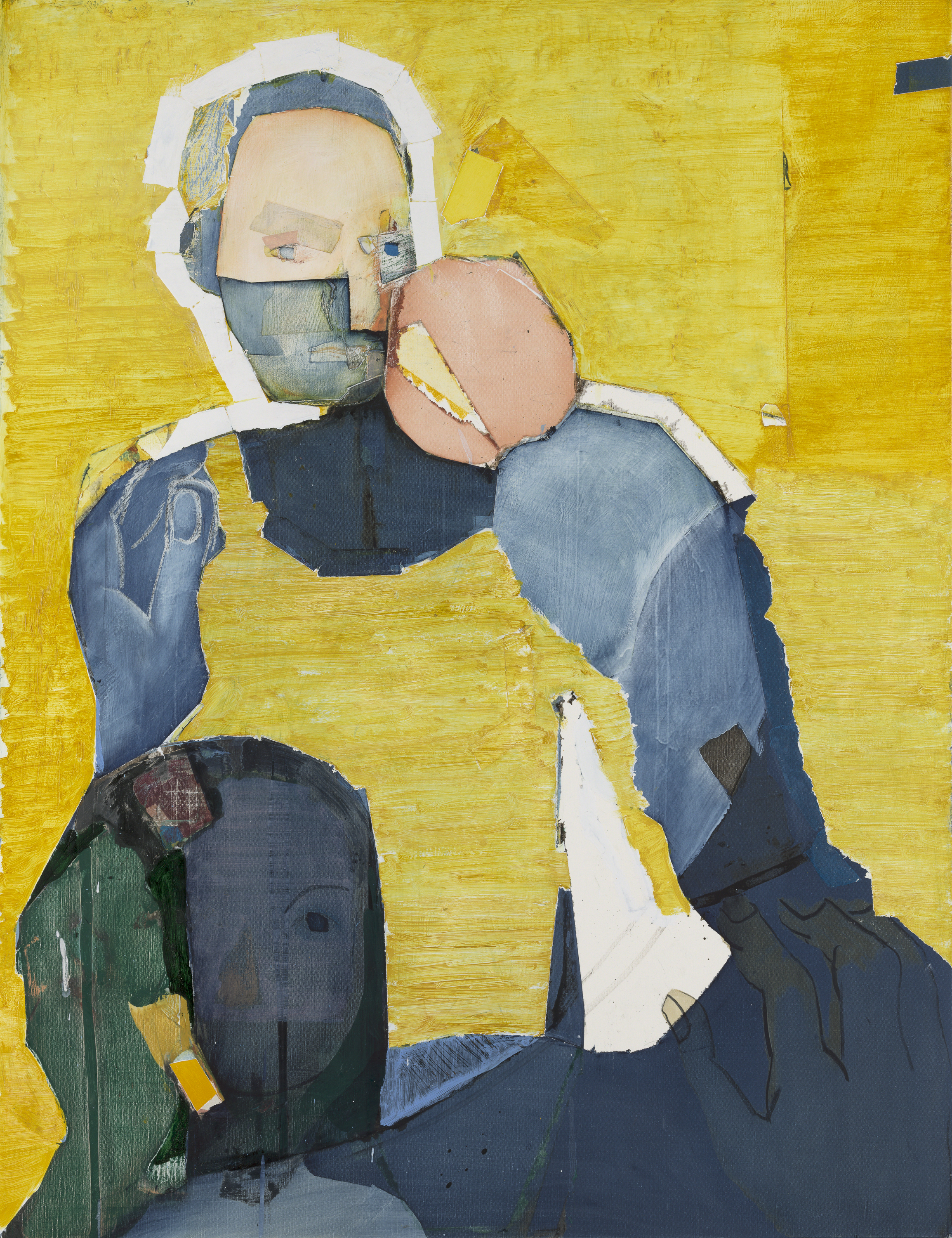 Magnus Plessen creates works that combine diverse painterly methods and approaches to reality (systems of representation) within an image. The limbs of the figures are generally outlined fragmentarily, while the hands are freely sketched and placed within an otherwise undeveloped plane in a way reminiscent of a sculptor’s preparatory or volumetric sketch. Other elements approximate reality, whereby the artist attempts to achieve what amounts to the impossible in the medium of painting, namely an imprint of the real. Still other areas are painted with free brushstrokes. What most of these painterly methods have in common is that the paint is partially removed and taken back by being scraped with a palette knife, wiped with a cloth, removed with sticky tape or rubbed with printing paper.