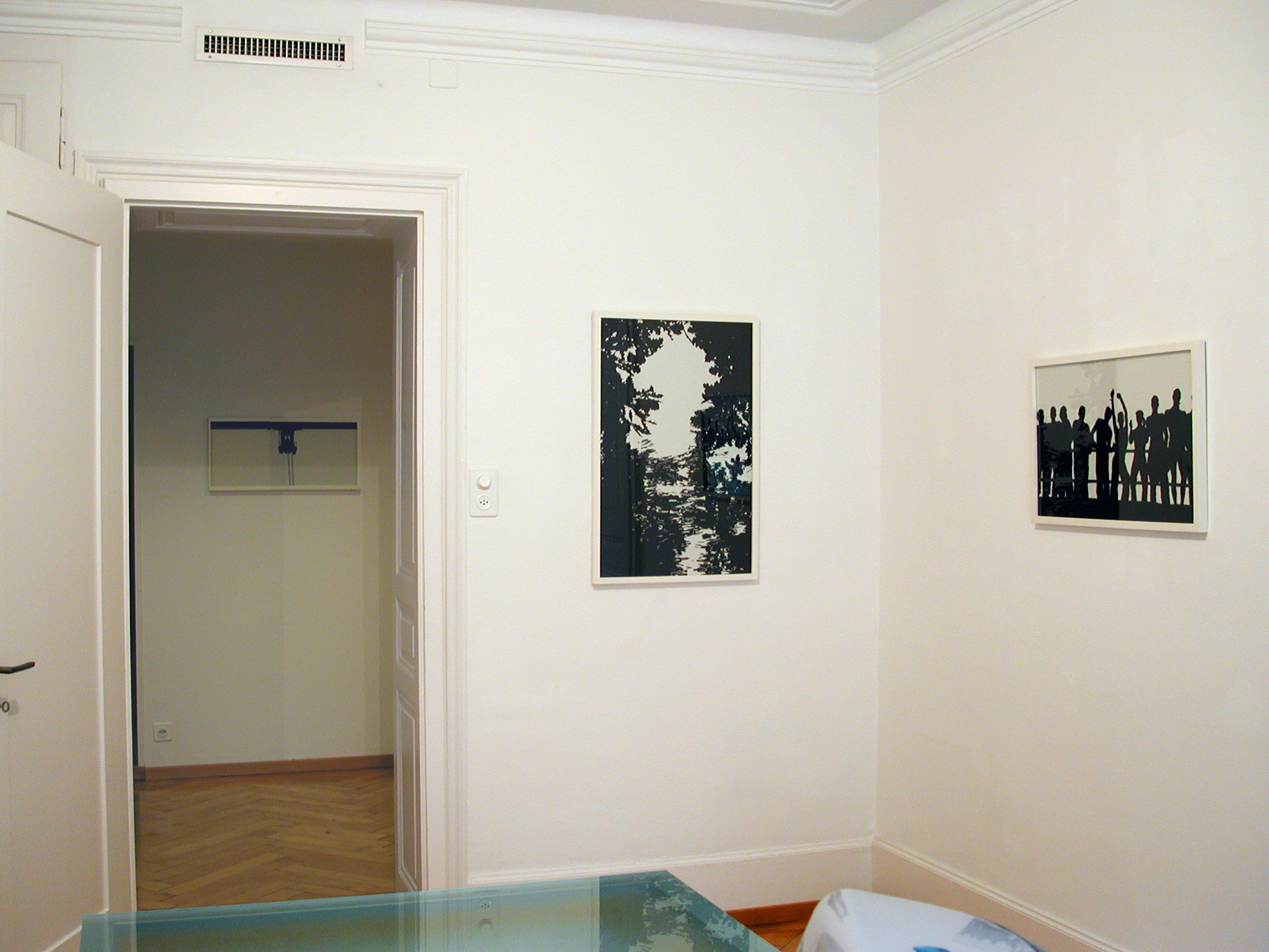 Stefan Thiel has made quite an impact with his encyclopaedic work The 120 Days of Sodom or The School of Debauchery, 1994-98, in which he literally transcribes the works of Marquis de Sade into braille. In his new works Thiel again uses a binary system: he transfers photographs (increasingly his own) into silhouettes. The harsh black and white contrasts in his pictures lead to an intensified precision as well as to an aestheticism of the portrayed. Hereby their symbolic quality becomes apparent, yet again is infiltrated by Thiel’s choice of objects. He shows us everyday situations, details of the countryside and citylife as well as single objects. Though sceneries may be populated, no relationships of a narrative nature are formed.