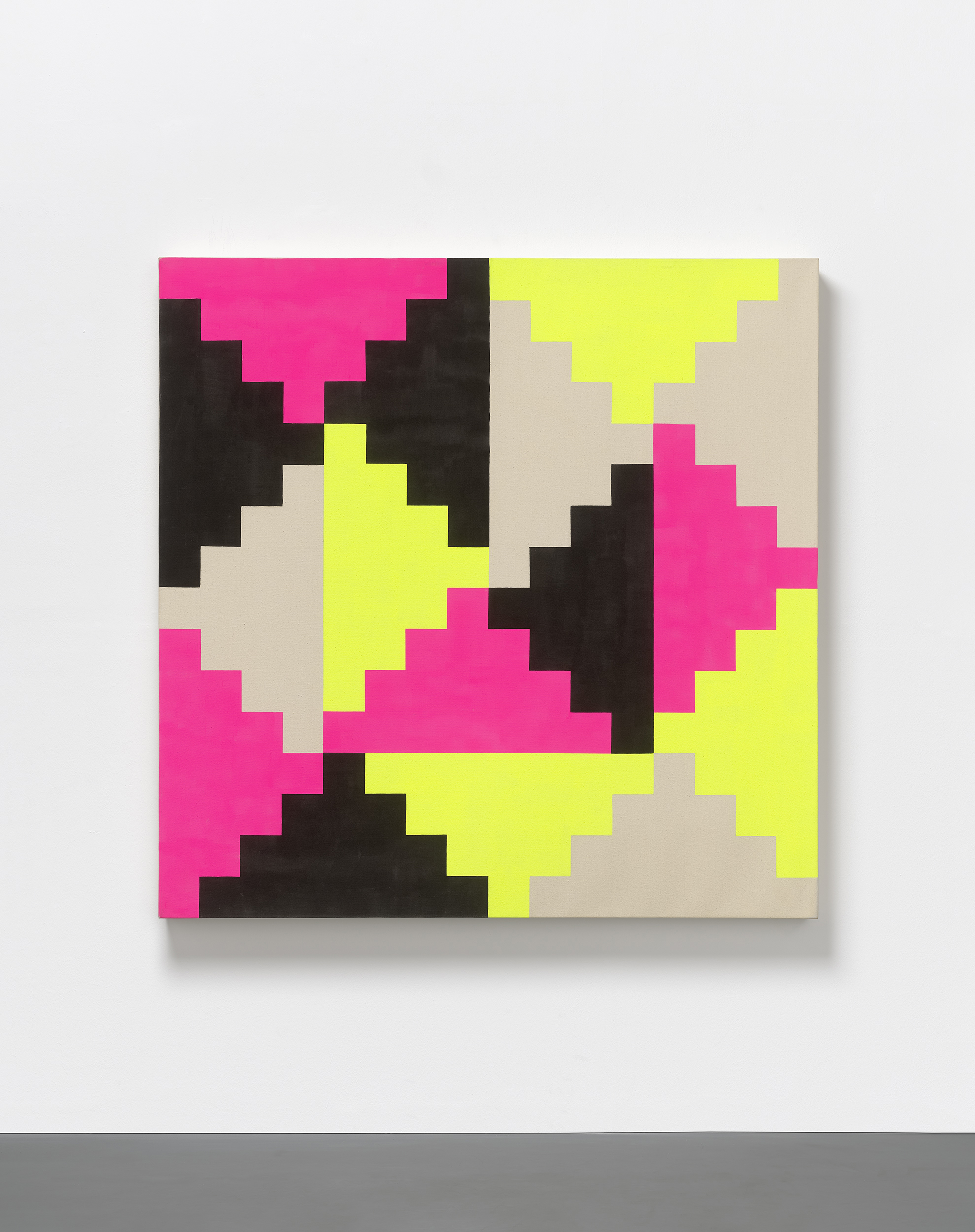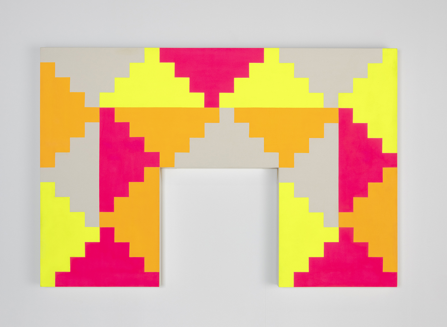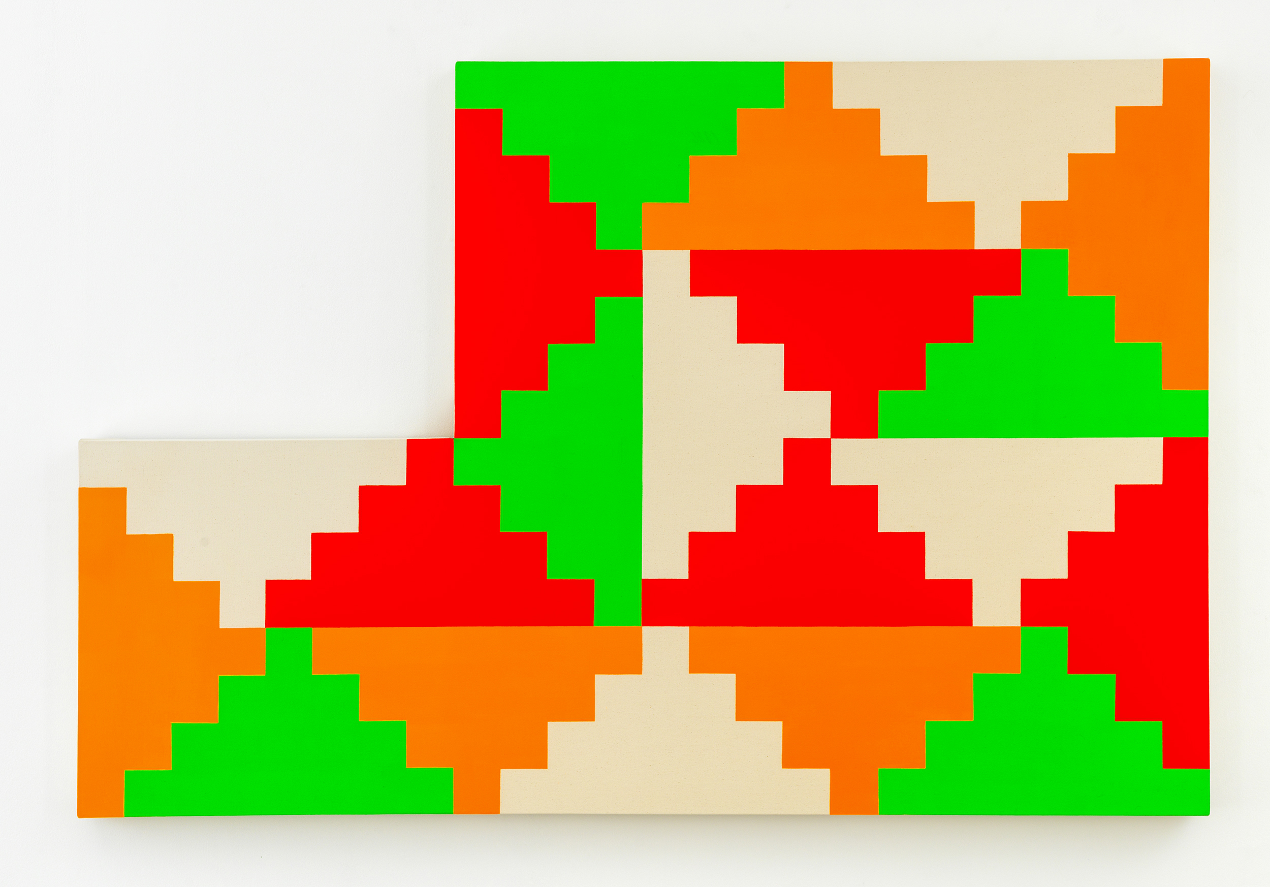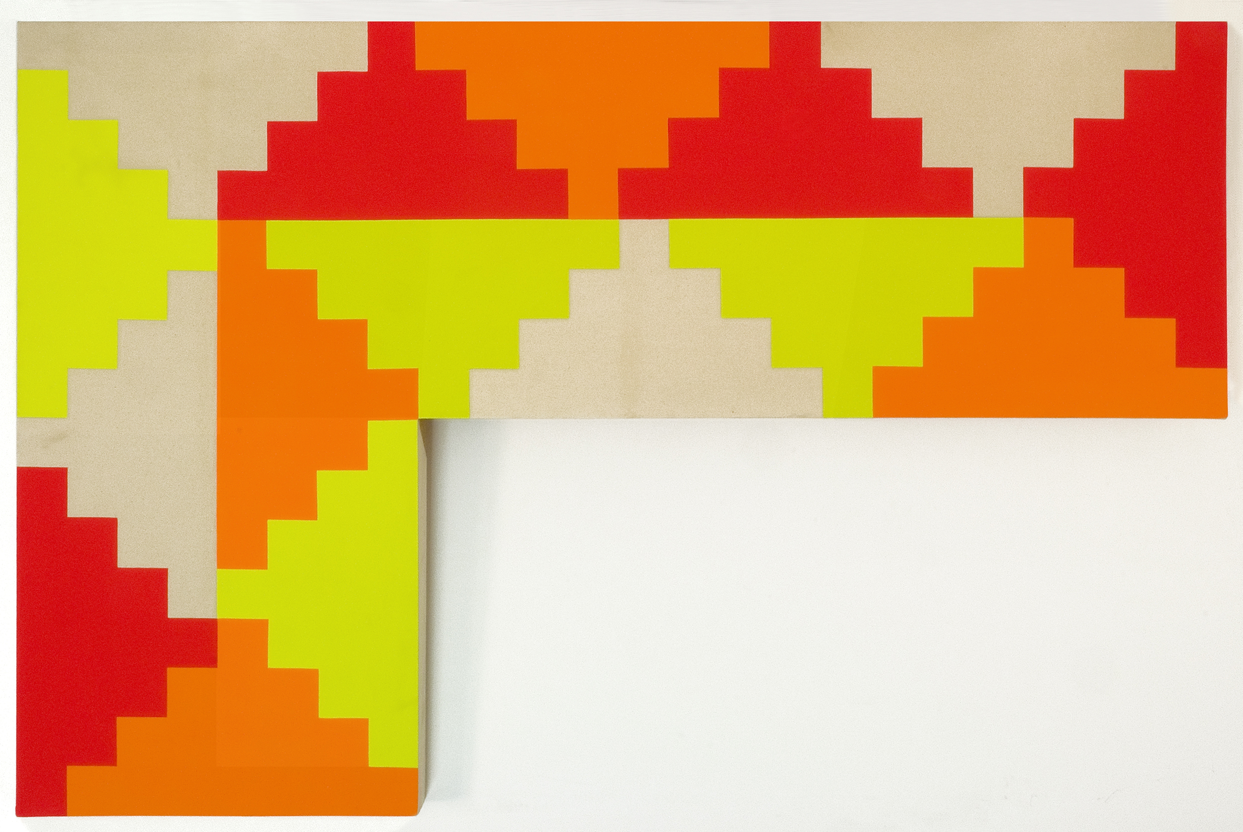 General Idea’s Ziggurat paintings (1968 and 1986) are assembled so that four materials—oil paint, decorator house paint, fluorescent acrylic paint, and raw canvas, each a different color—never touch one another. The ziggurat series, conceived in the late sixties, appropriates the methods of New York Color Field Painting, especially Frank Stella. The original drawings of 1968 use the ziggurat form to generate rectangles of different proportions and then allow them to escape the rectangle to generate technically more demanding shaped forms. The various rectangles were painted in 1968, but the squares and shaped forms were not produced until 1986, when General Idea completed the project with six squares and six shaped forms. All of these retain the original formula of four repeating materials corresponding with four colors. The resulting paintings were notable for their physicality, with a depth of four inches matching the height of the Ziggurat steps depicted, lending them a pronounced object-like quality.