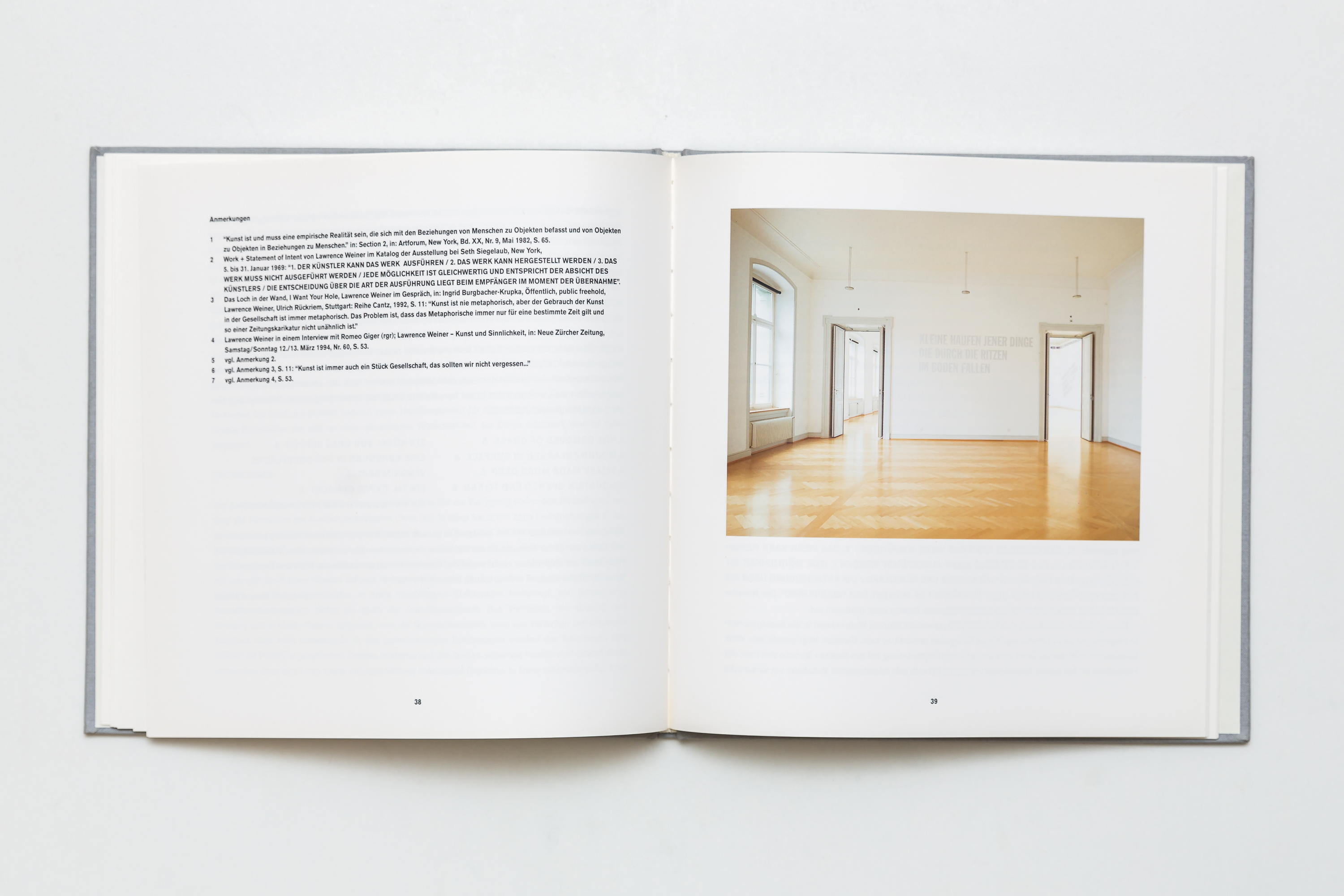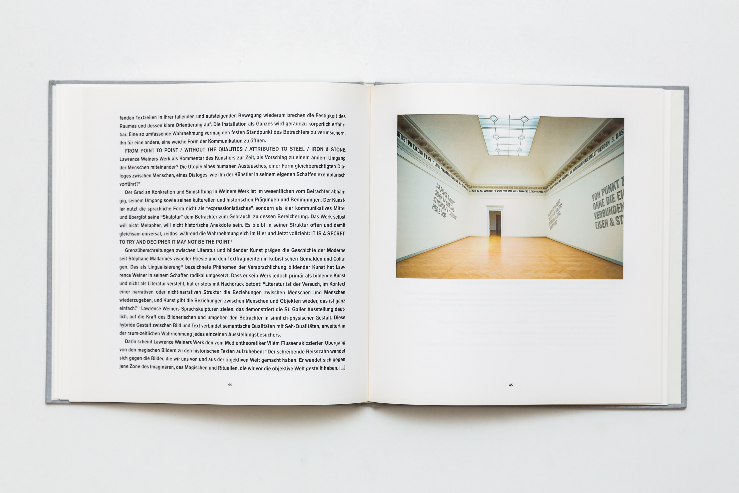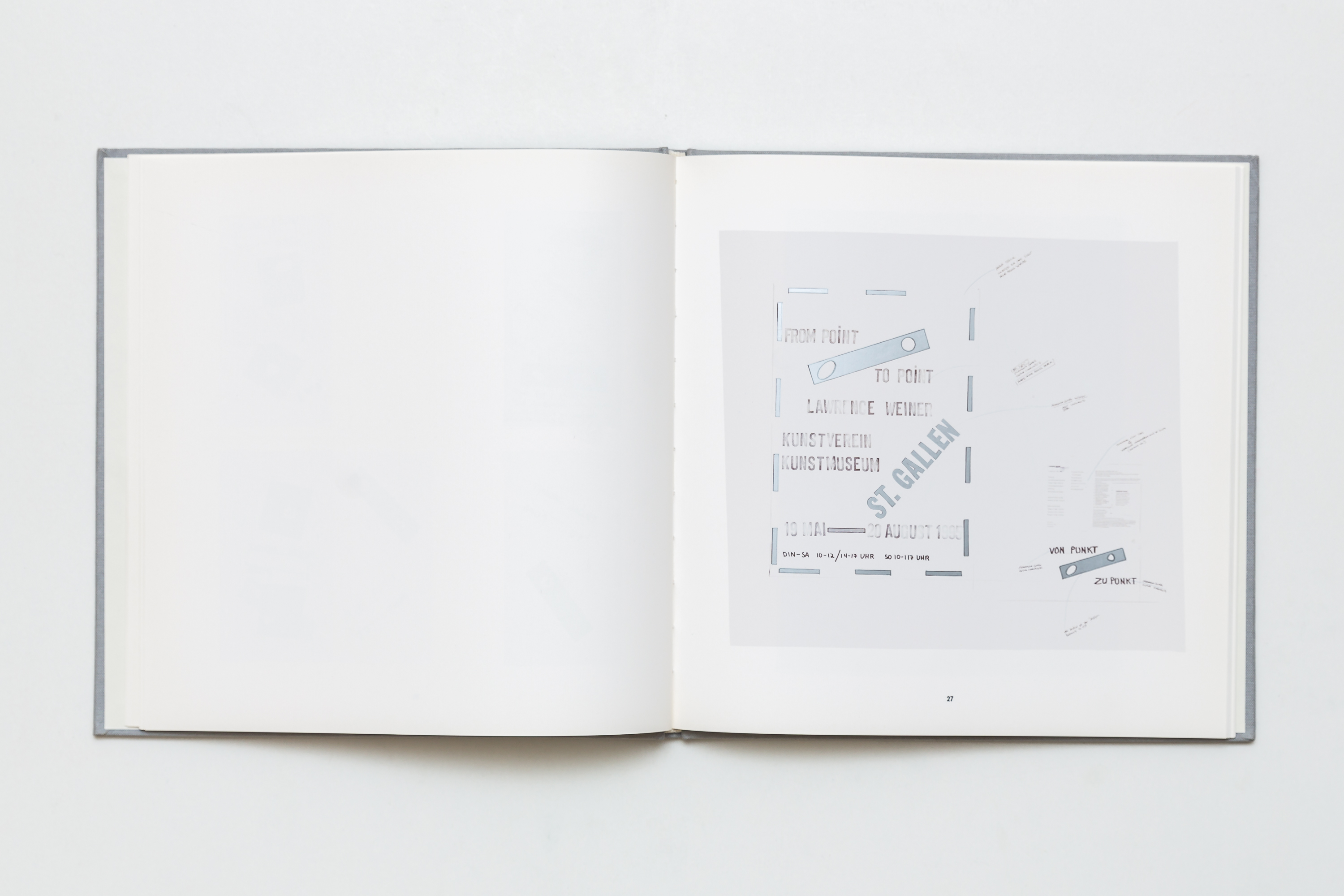 publication Lawrence Weiner FROM POINT TO POINT Prev Next Prev Next × Prev Next × × × × × Exhibition catalogue From Point to Point at Kunstmuseum St. Gallen in 1995. Hardcover 26.2 x 25.8 cm PUBLICATION DATE: 1995 LANGUAGE: DE / EN PUBLISHER: Kunstverein St Gallen DESIGNER: Lawrence Weiner EDITOR: Roland Wäspe, Konrad Bitterli 68 pages ISBN: 978-3927789548
